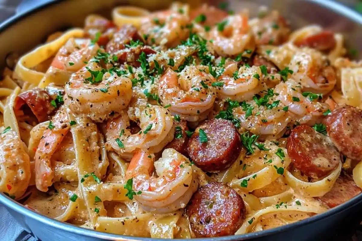 A rich and creamy Cajun pasta packed with juicy shrimp and smoky sausage—perfect for a quick, flavorful weeknight dinner!